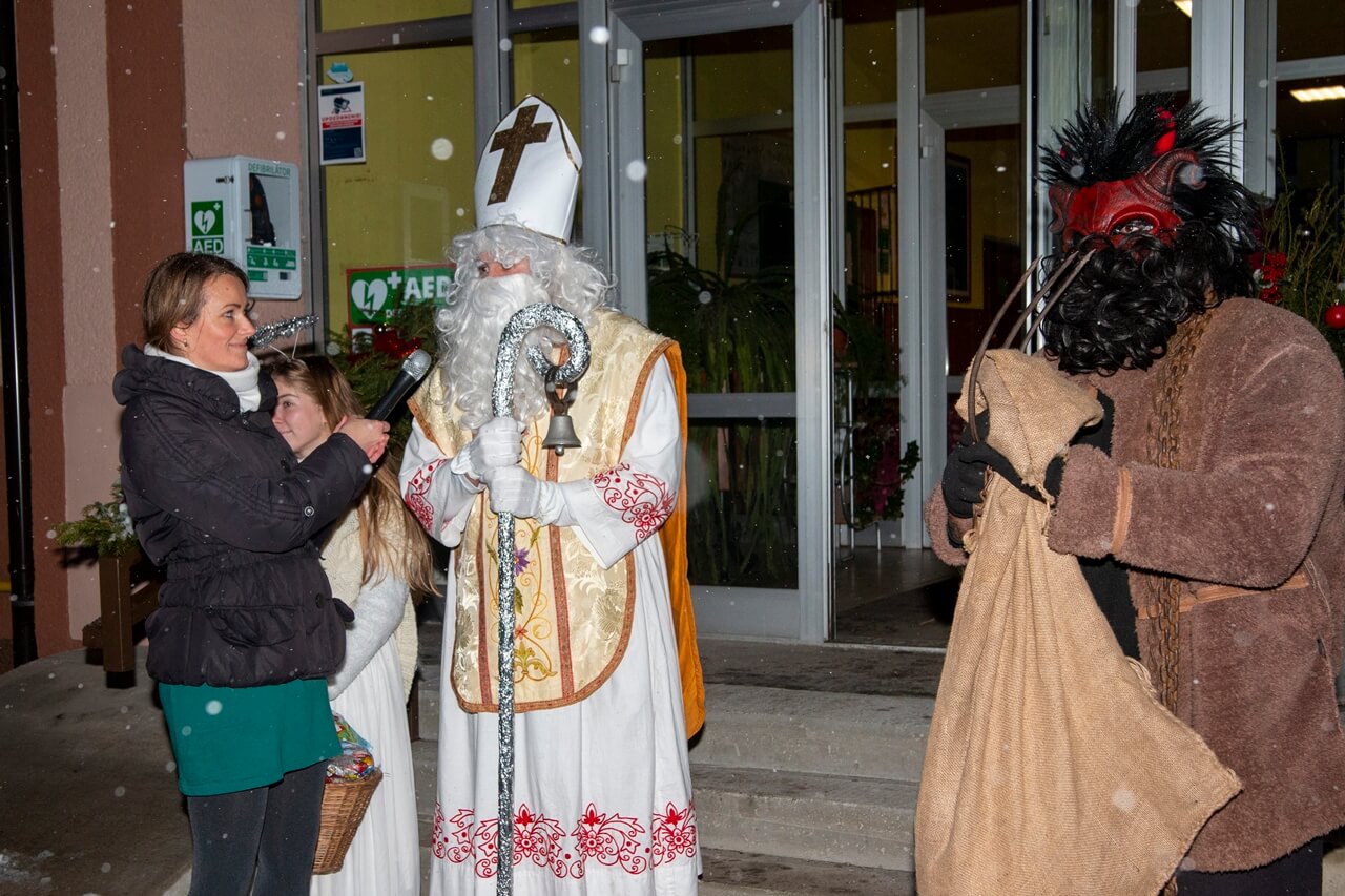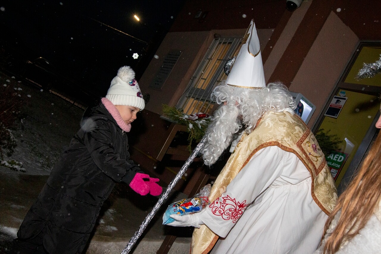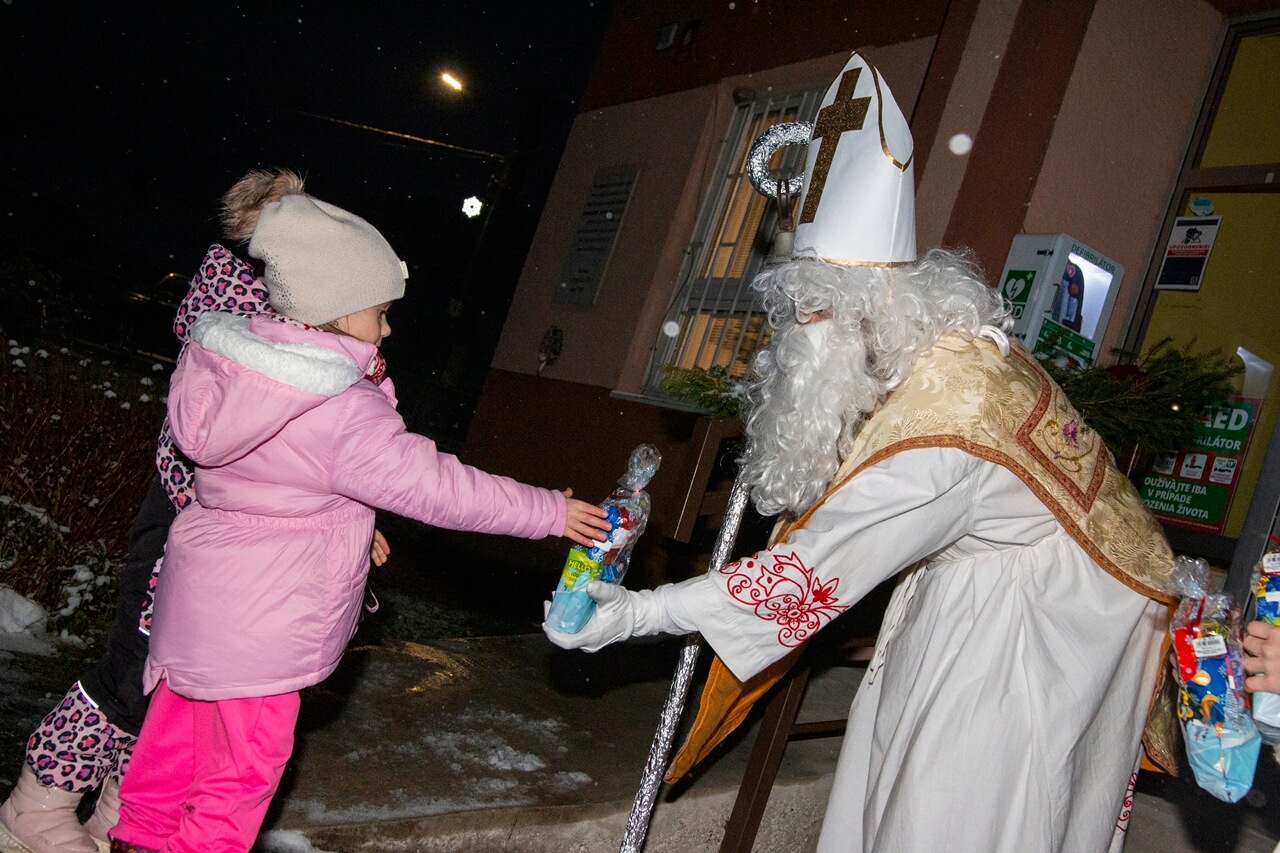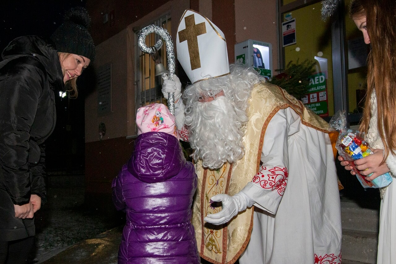 Privítanie Mikuláša pred obecným úradom.